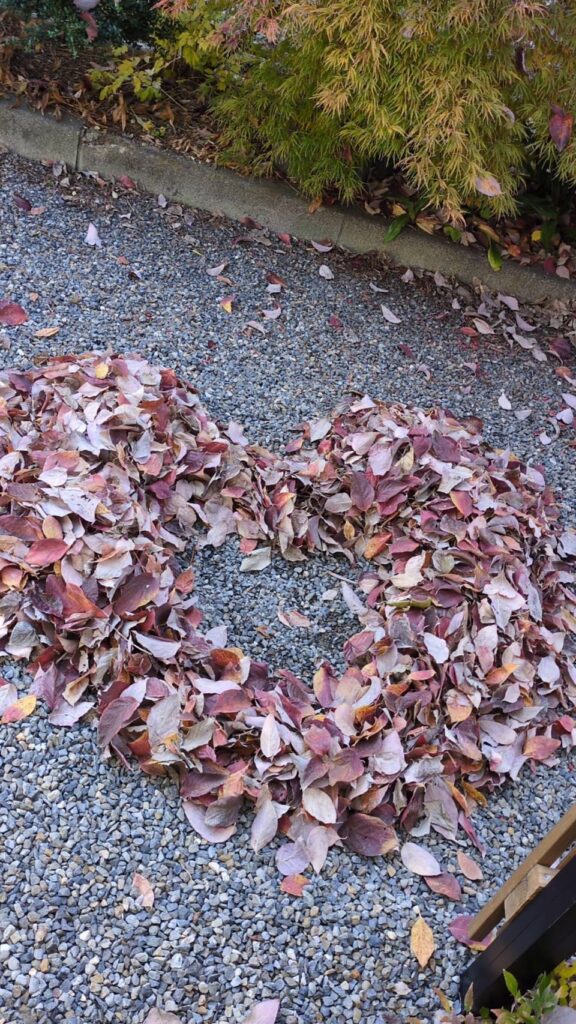11月最後、庭の落ち葉がすごくて、あー、これはお掃除しなくちゃ…なーんて思っていたら、美智子さんがこんなお茶目な事をしてくれました笑