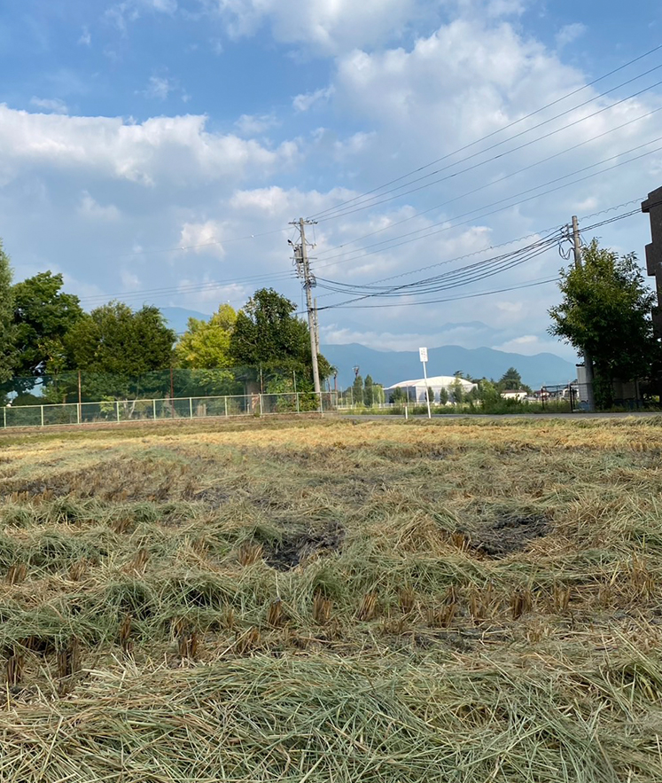 稲もだいぶ色づいてきたなーと思った矢先、もう稲刈りが済んでいる田んぼを発見!